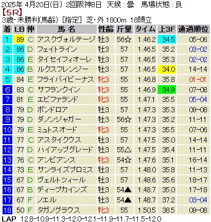 前半値74(↓23)→上がり3F値122(↑25)=98(↑1)