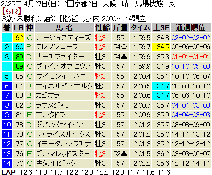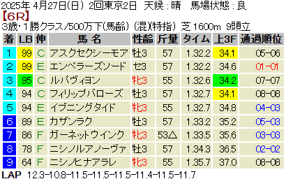 【LB指数レポート】2025/04/27 [フローラS]カムニャック [3歳1勝C]アスクセクシーモア [3歳未勝利]アールヴィヴァン・ルージュスティーズ・ウインポセイドン・レヴーズマン・タマカヅラ・シャインベック・ユーティジャーニー