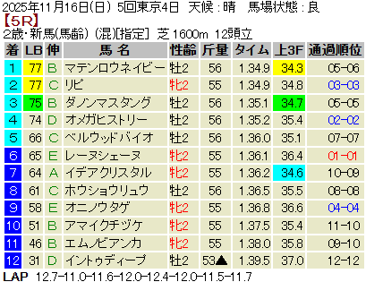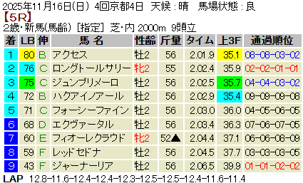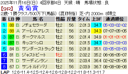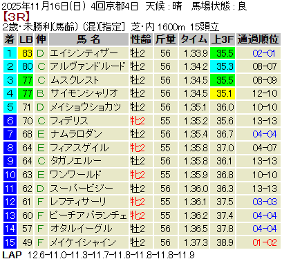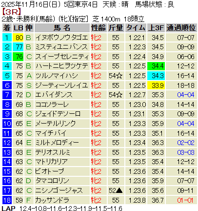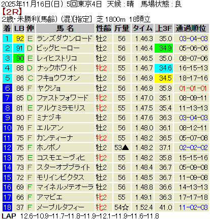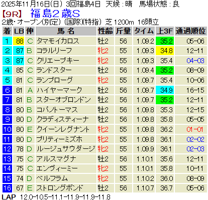 【LB指数レポート】2025/11/16 [黄菊賞]ノチェセラーダ [福島2歳S]タマモイカロス [2歳新馬]アクセス・マテンロウネイビー [2歳未勝利]エイシンティザー・イヌボウノウタゴエ・ランズダウンロード