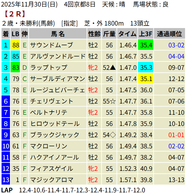 かなりキツい流れだったが、先行から粘り込みサウンドムーブ。持久力型伸Eで基準値クリアと前走新馬4着87B「Good!」走破をみると、なかなか地力あるなと思う。
