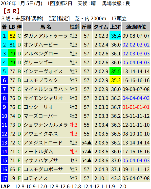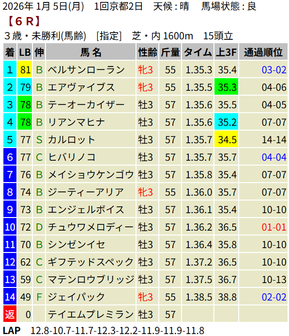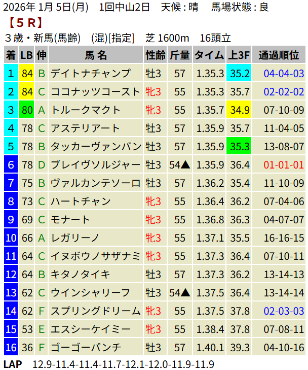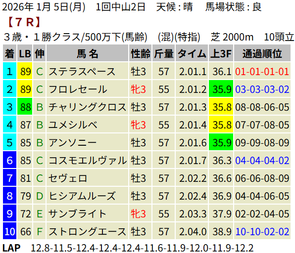 【LB指数レポート】2026/01/05 [3歳1勝C]ステラスペース [3歳新馬]デイトナチャンプ [3歳未勝利]イモータリス・ベルサンローラン・タガノアルトゥーラ