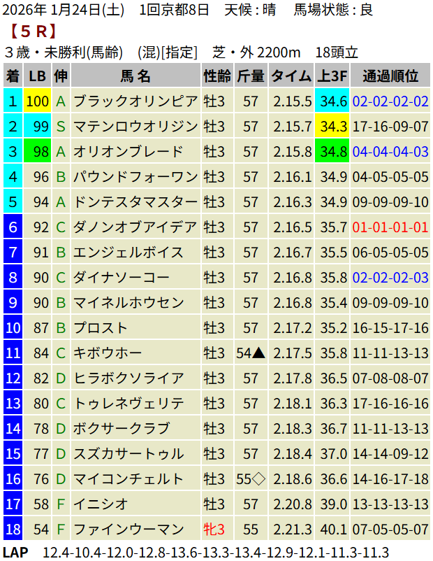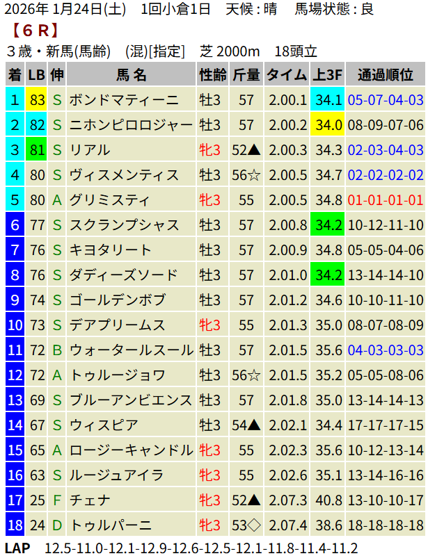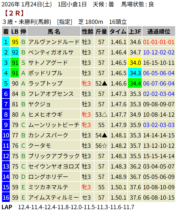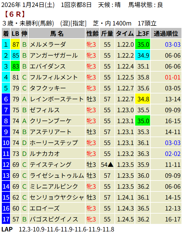【LB指数レポート】2026/01/24 [若駒S]ショウナンハヤナミ [萌黄賞]ルージュサウダージ [3歳新馬]ボンドマティーニ [3歳未勝利]メルメラーダ・ミッキーファルコン・ブラックオリンピア・アルヴァンドルード