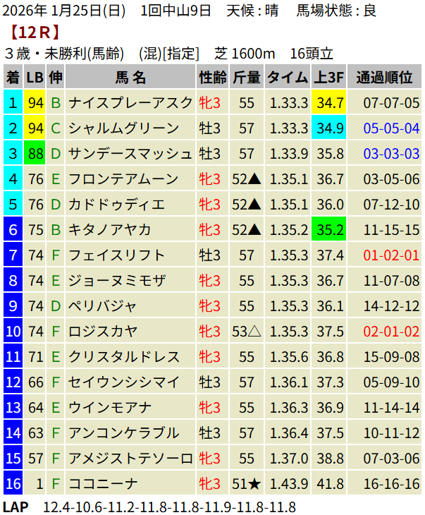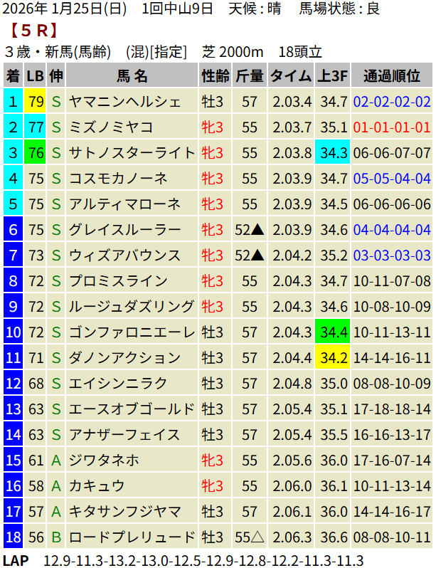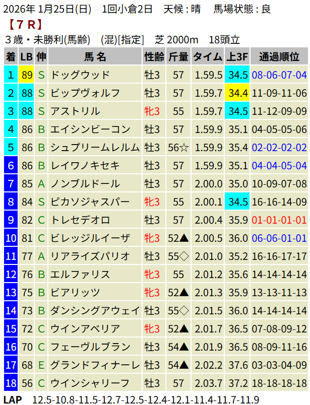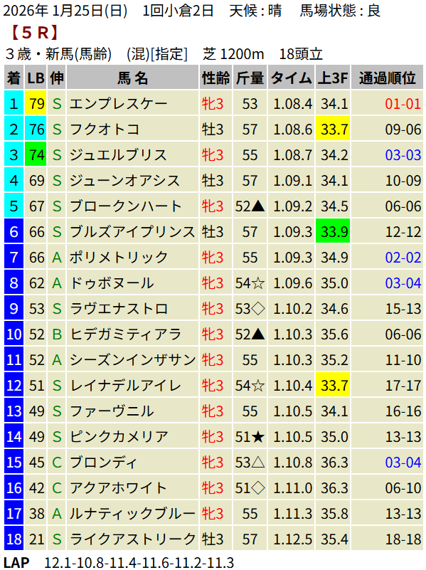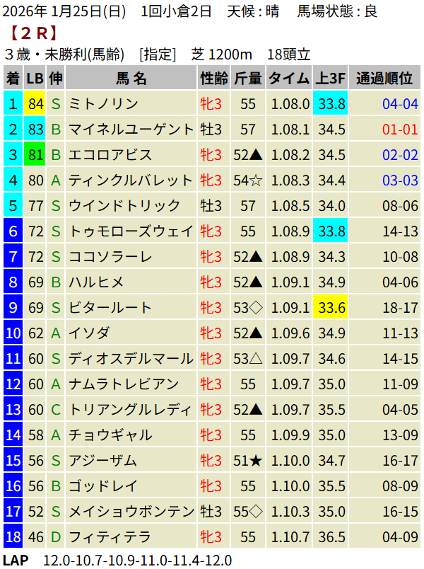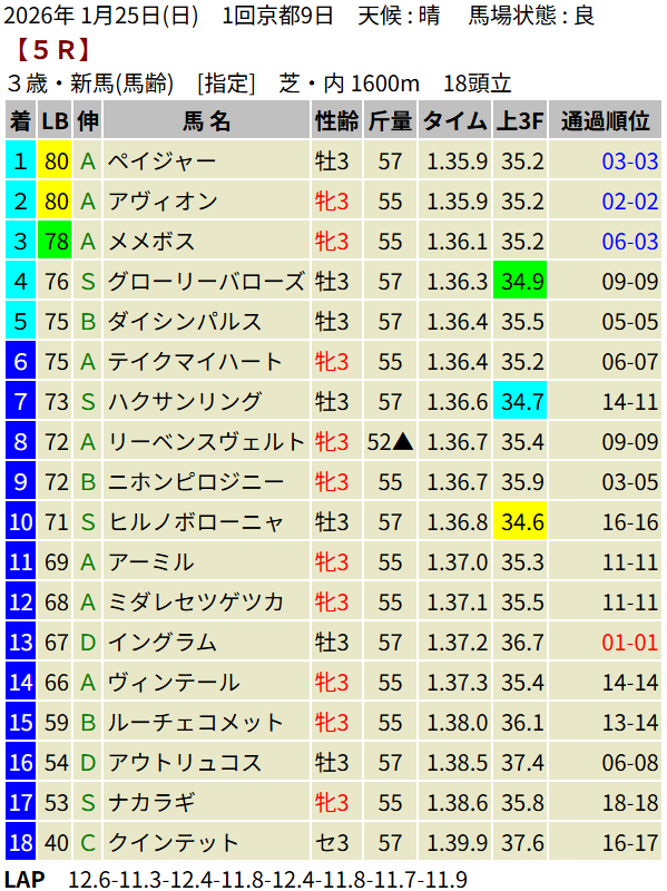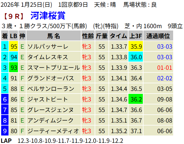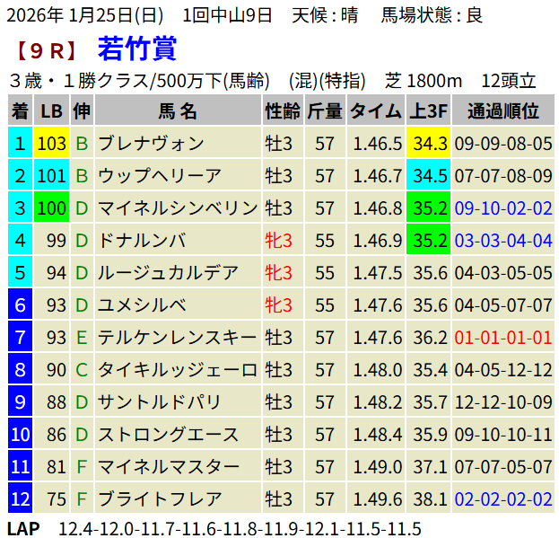 【LB指数レポート】2026/01/25 [若竹賞]ブレナヴォン [河津桜賞]ソルパッサーレ [3歳新馬]ペイジャー・ヤマニンヘルシェ・エンプレスケー [3歳未勝利]ナイスプレーアスク・ドッグウッド・ミトノリン