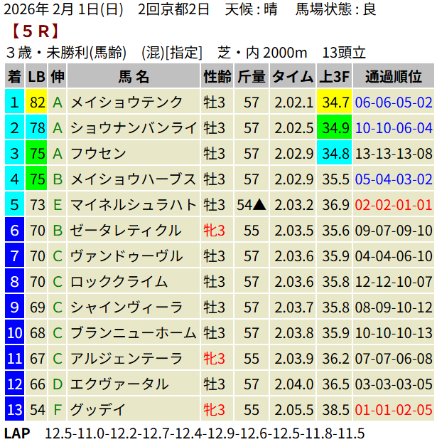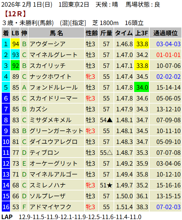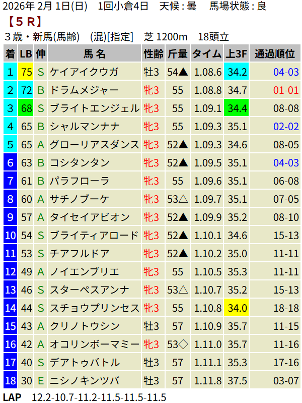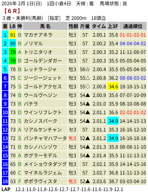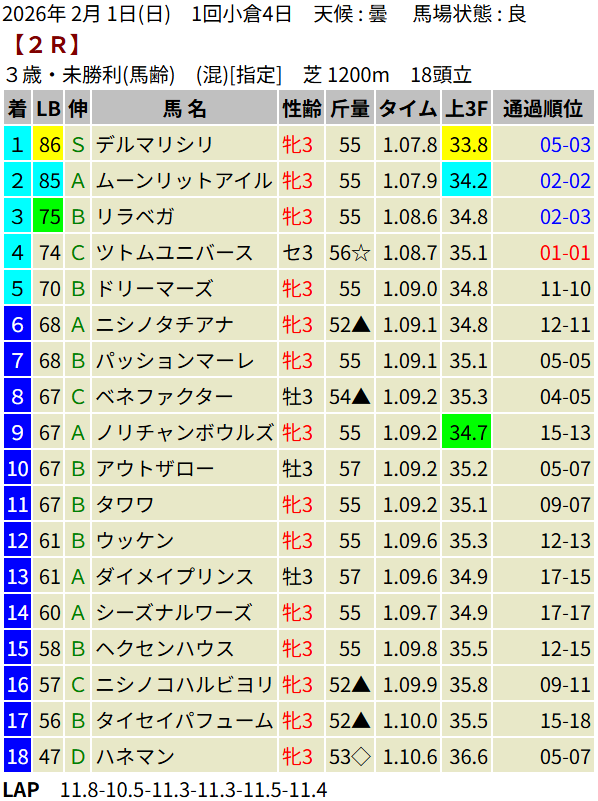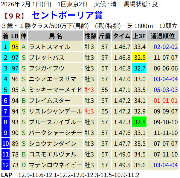 【LB指数レポート】2026/02/01 [セントポーリア賞]ラストスマイル [3歳新馬]アスクイキゴミ・ケイアイクウガ [3歳未勝利]アウダーシア・マカナアネラ・メイショウテンク・デルマリシリ