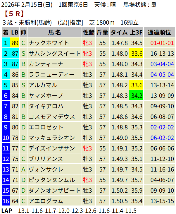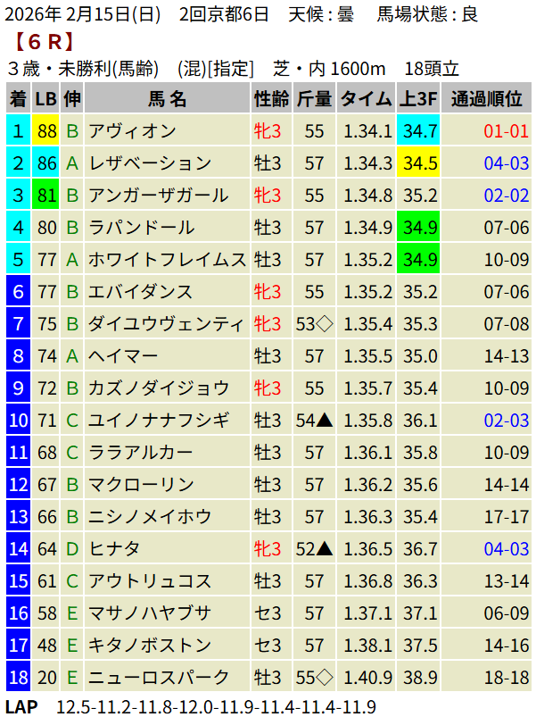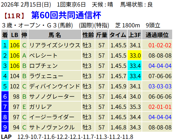 【LB指数レポート】2026/02/15 [共同通信杯]リアライズシリウス [3歳未勝利]アヴィオン・ナックホワイト・ピカキウイ・モウエエデショー・エバーラスト