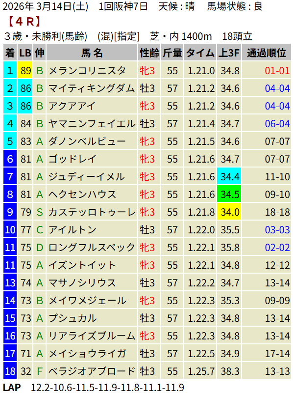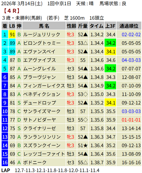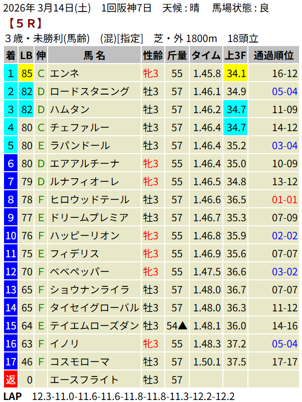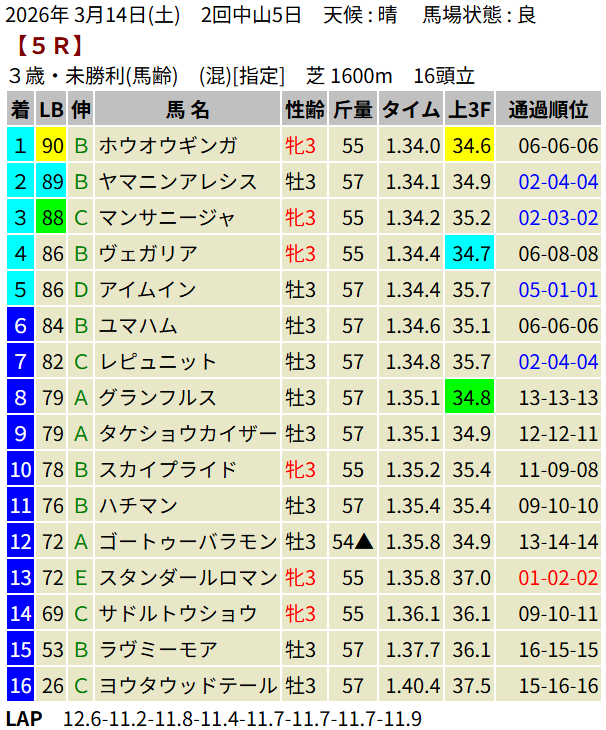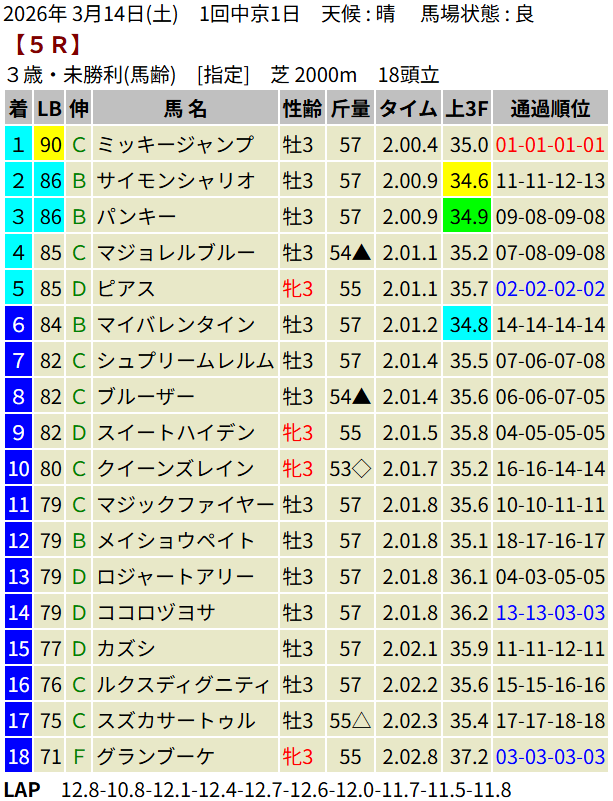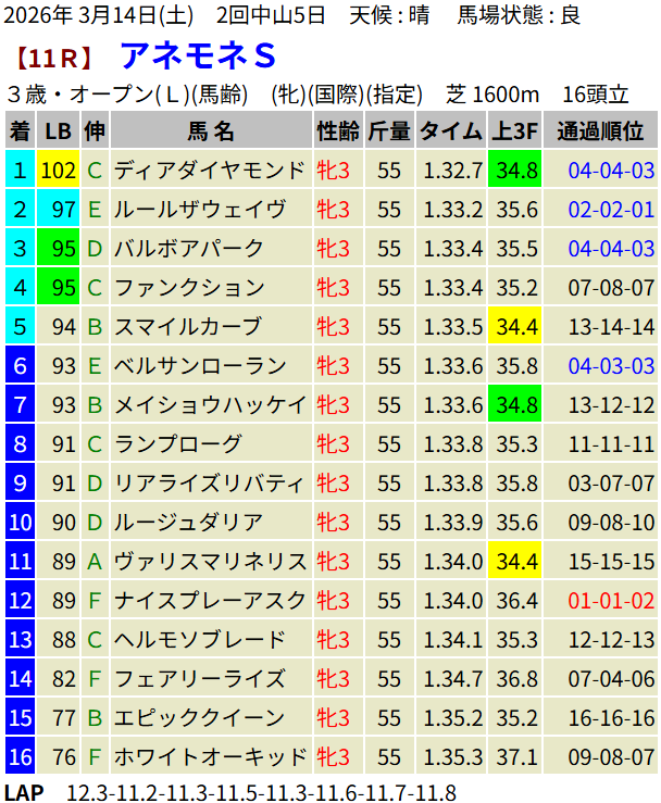 【LB指数レポート】2026/03/14 [アネモネS]ディアダイヤモンド [3歳未勝利]ホウオウギンガ・エンネ・ミッキージャンプ・メランコリニスタ・ルージュリリック