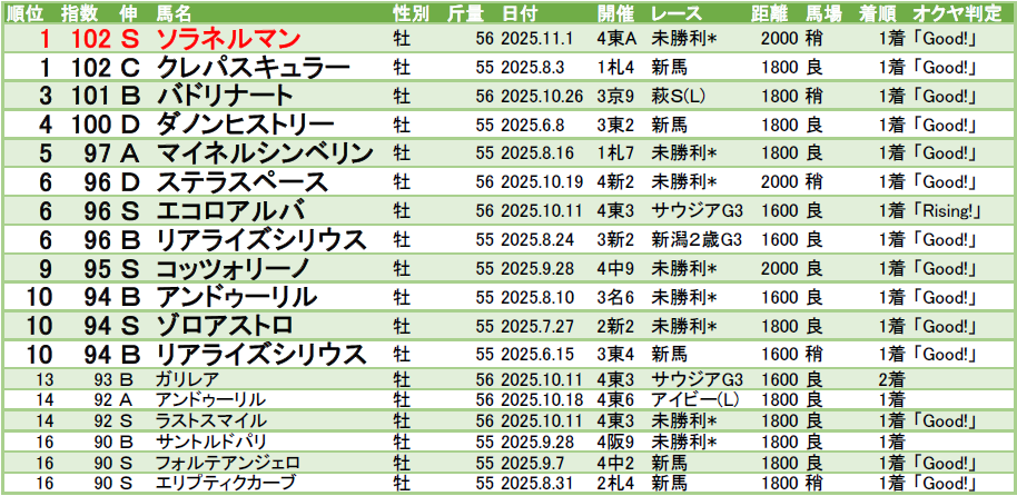 未勝利「Good!」突破ソラネルマンはトップへランクイン。新馬2着90S「Good!」→未勝利1着102S「Good!」の「Good!」連発が優秀かつ「上昇力の伸S」をキープ。このパターンはチェルヴィニア・ブレイディヴェーグ・レッドモンレーヴと同じ。2世代目のフィエールマンから待望の大物候補誕生だ。