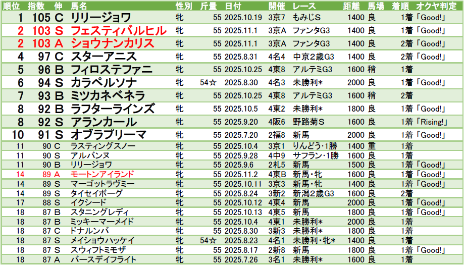 【LB指数ランキング】25-26クラシック編 2025/11/02版 ファンタジーS勝利フェスティバルヒル・2着ショウナンカリス、新馬勝利モートンアイランド、未勝利突破ソラネルマンがランクイン
