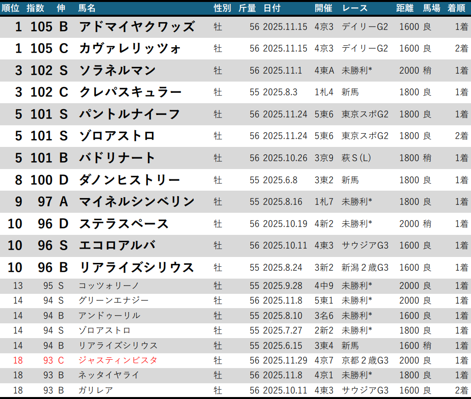 京都2歳S勝利ジャスティンビスタは18位にランクイン。ギリギリランカーではあるが、新馬1着83B→京都2歳S1着93Cの2戦指数推移は優秀かつ、指数上昇力がある伸SA実績がないのに上昇できているしぶとさは見逃せない。