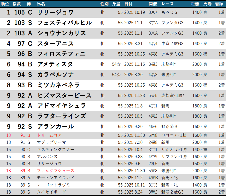 未勝利突破ファムクラジューズは18位にランクイン。同コースの前走未勝利5着96S「Good!」から指数を下げたが、そのぶん楽勝かつランクインに成功。あなどれない。