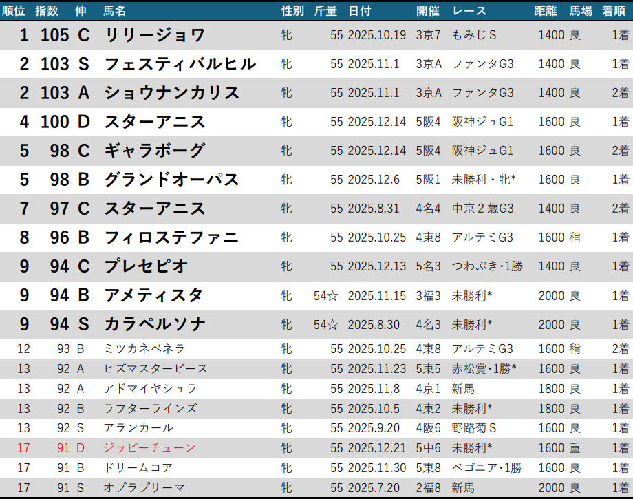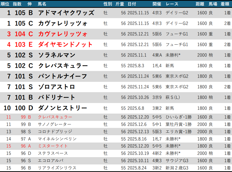 【LB指数ランキング】25-26クラシック編 2025/12/21版 朝日杯FS制覇カヴァレリッツォ・2着ダイヤモンドノット、ひいらぎ賞クレパスキュラー、未勝利突破ミスターライト・ジッピーチューンがランクイン