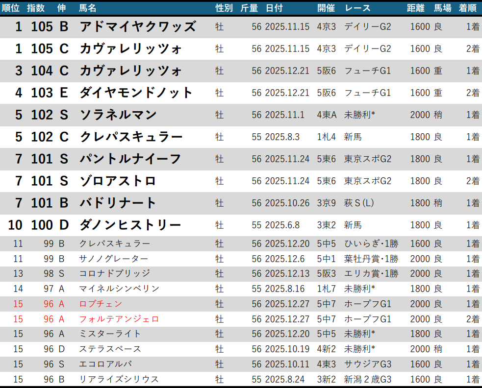 ホープフルS制覇ロブチェンは15位へランクイン。指数は2歳G1水準100を下回り、新馬戦(1着77A)の指数も新馬基準値80に達せずも、菊花賞と天皇賞春を勝った父ワールドプレミアらしいスタミナを感じさせてくれる末脚でデビュー2連勝の載冠となった。次の目標は100以上、できれば105あたりへの対応力とそれに伴うランクアップになるが、両方が叶えば必然的に皐月賞でも上位争いだ。伸A続き。期待できるだけの伸びしろは十分に残している。