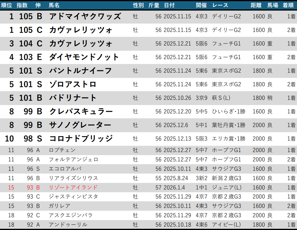 【LB指数ランキング】25-26クラシック編 2026/01/05版 ジュニアCリゾートアイランド、3歳1勝Cジュウリョクピエロがランクイン
