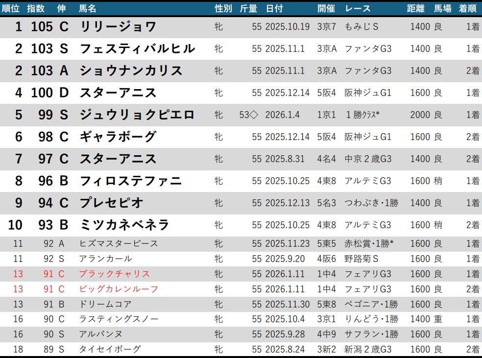 フェアリーS勝利ブラックチャリスは13位へランクイン。重賞としては少し物足りない指数だが、芝1200mの新馬1着96Bと芝1400mのファンタジーS4着102Aは高指数の「Good!」走破だった。1600mに完全対応できたとは言い切れないが、持てるスピードは世代トップレベルに疑いなし。