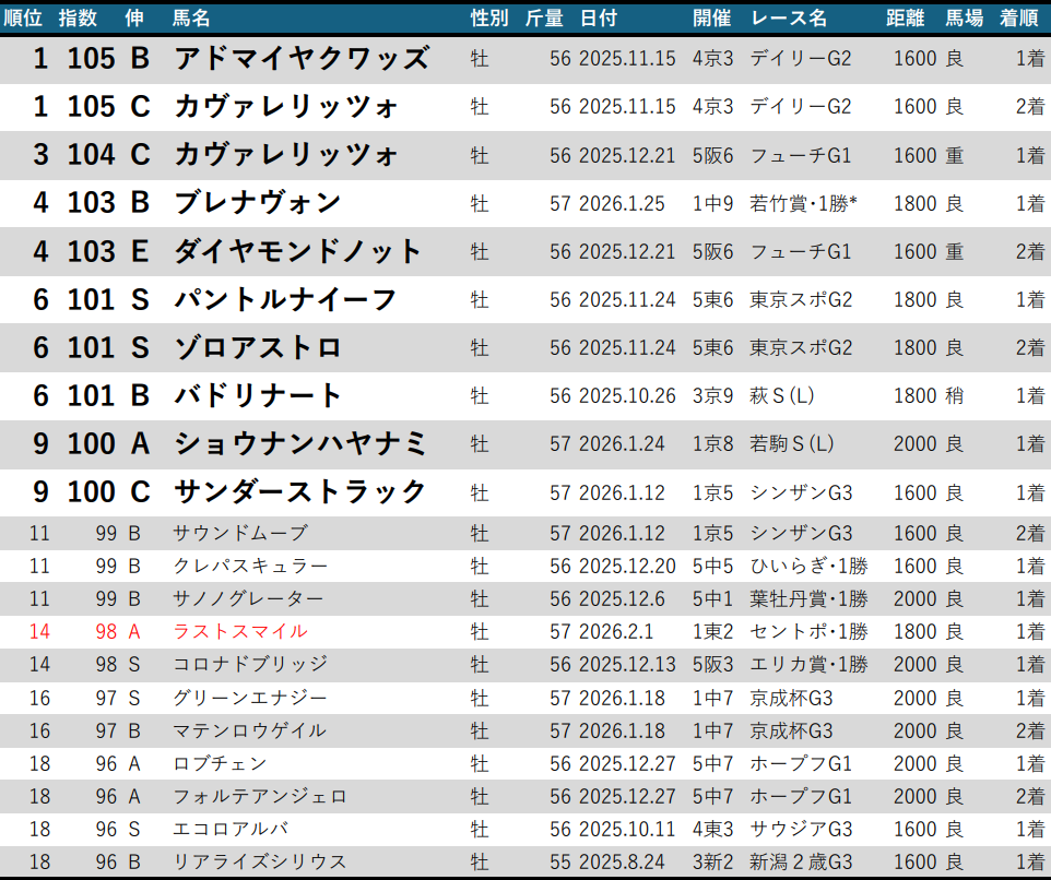 セントポーリア賞を勝ったラストスマイルは14位へランクイン。2歳秋以降の直近3戦はすべて東京芝1800mへ出走し、その指数推移は未勝利1着(92S)「Good!」→東スポ杯2歳S5着(97A)→セントポーリア賞1着(98A)。安定して高打点をマークし続けつつ、伸SAの指数上昇力も残しており、皐月賞・ダービー出走級の素質を秘めている。ランクインは未勝利突破当時の11位以来2度目。今後TOP10入りなら必然的にクラシック出走は確定するし、好走まで狙える存在になるだろう。