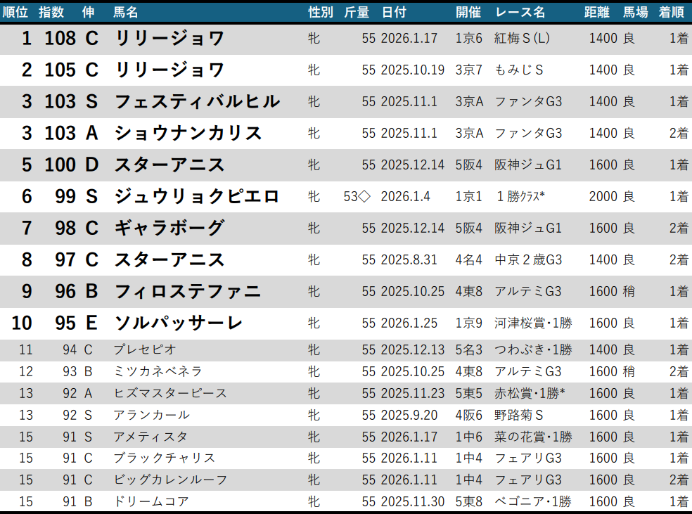 セントポーリア賞5着(95A)ミッキーマーメイド、同7着(94S)リスレジャンデールあたりの隠れランカーと、指数は上がらなかったがクロッカスS2着(90B)で復調気配ハッピーエンジェルの台頭に期待したい。