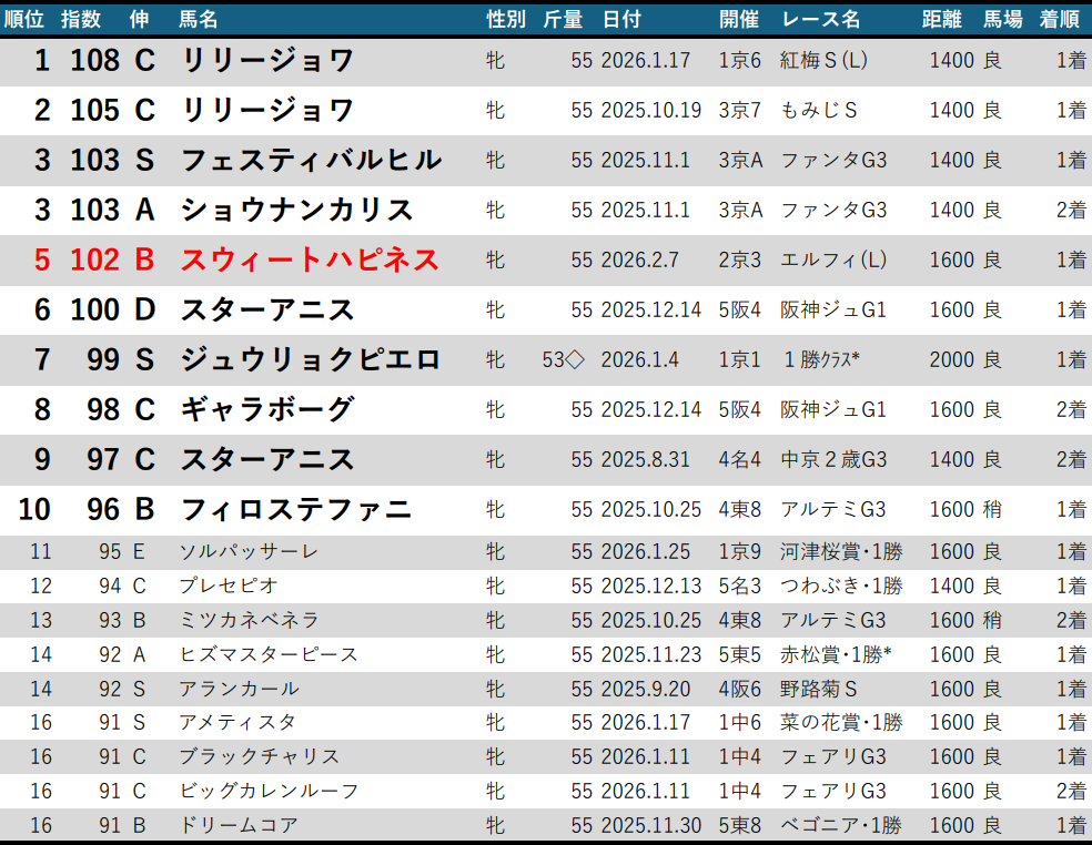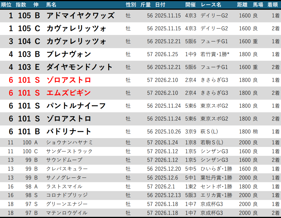 【LB指数ランキング】25-26クラシック編 2026/02/10版 きさらぎ賞ゾロアストロ・2着エムズビギン、エルフィンSスウィートハピネスがランクイン