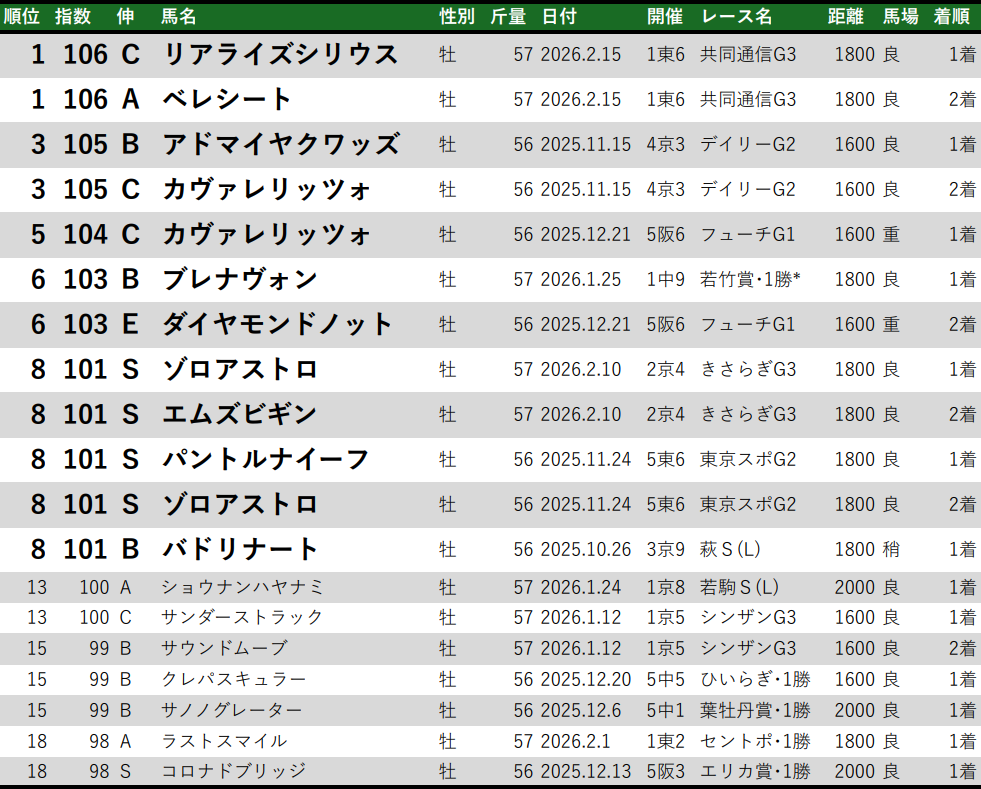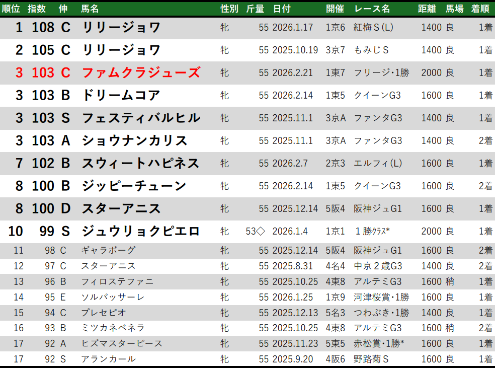 【LB指数ランキング】25-26クラシック編 2026/02/22版 フリージア賞ファムクラジューズがランクイン