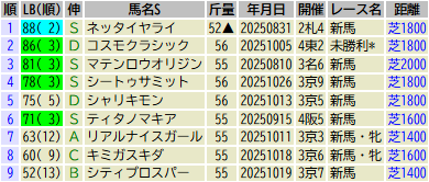 ※掲載データは出走馬名表が発表された木曜時点のものです。発走までに出走取消や競走除外された馬が含まれていることがあります。